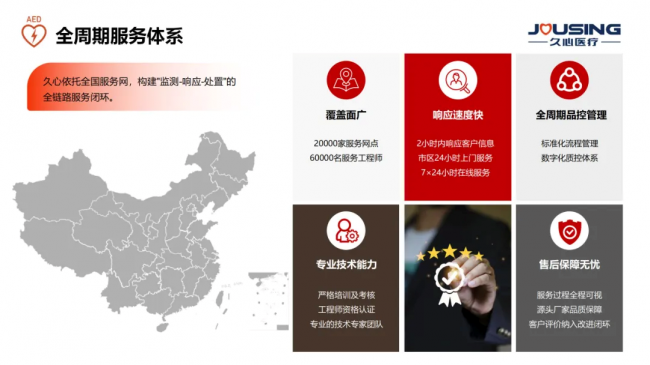 依托全域服务网络与高效响应体系,久心医疗打破地域与场景限制,推动 AED 从单一公共场景部署向全域覆盖升级,为公共急救网络建设提供稳定可靠的设备与服务支撑。