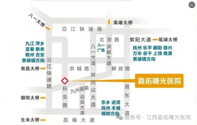 导航搜索“江西省医学科学院附属嘉佑曙光医院”西湖区抚生路858号嘉佑健康城。