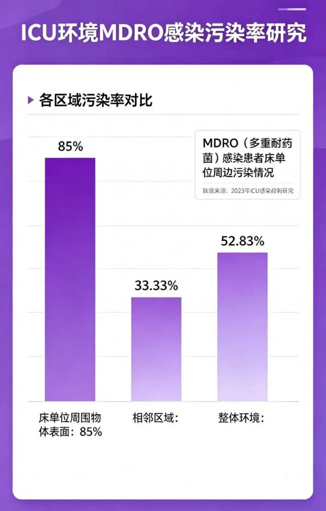研究表明,ICU新发MDRO感染患者床单位周围物体表面污染率高达85%,相邻区域为33.33%,整体环境为52.83%。其中,床栏、床边桌等高频接触表面污染严重,而患者直接使用的便盆、尿壶等护理器具更是病原体的重要储菌库。